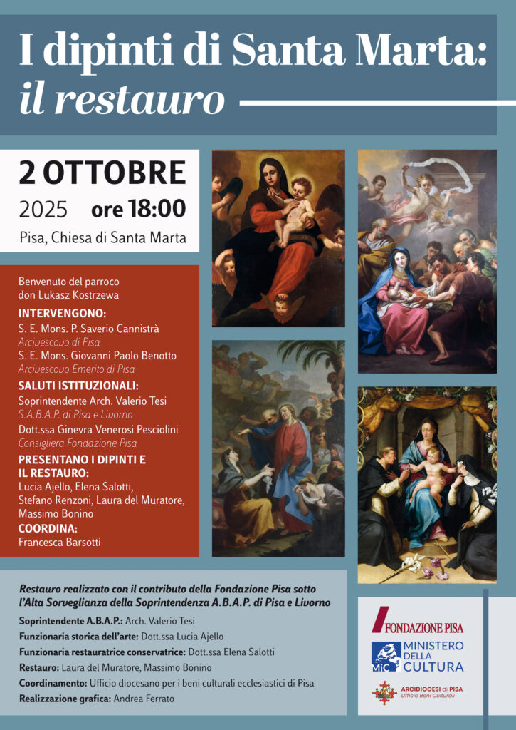 Il restauro di quattro dipinti della chiesa di Santa Marta conclude la campagna di riqualificazione strutturale che ha interessato l’edificio sacro negli ultimi anni, grazie al sostegno economico della Fondazione Pisa e sotto l’Alta Sorveglianza della Soprintendenza A.B.A.P. di Pisa…