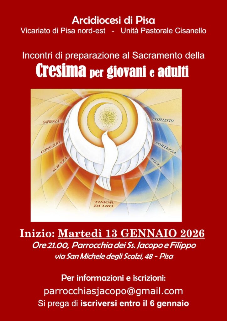Martedì 13 GENNAIO 2026Ore 21.00, Parrocchia dei Ss. Jacopo e Filippo via San Michele degli Scalzi, 48 – Pisa Per informazioni e iscrizioni: prega di iscriversi entro il 6 gennaioCresima per giovani e adulti