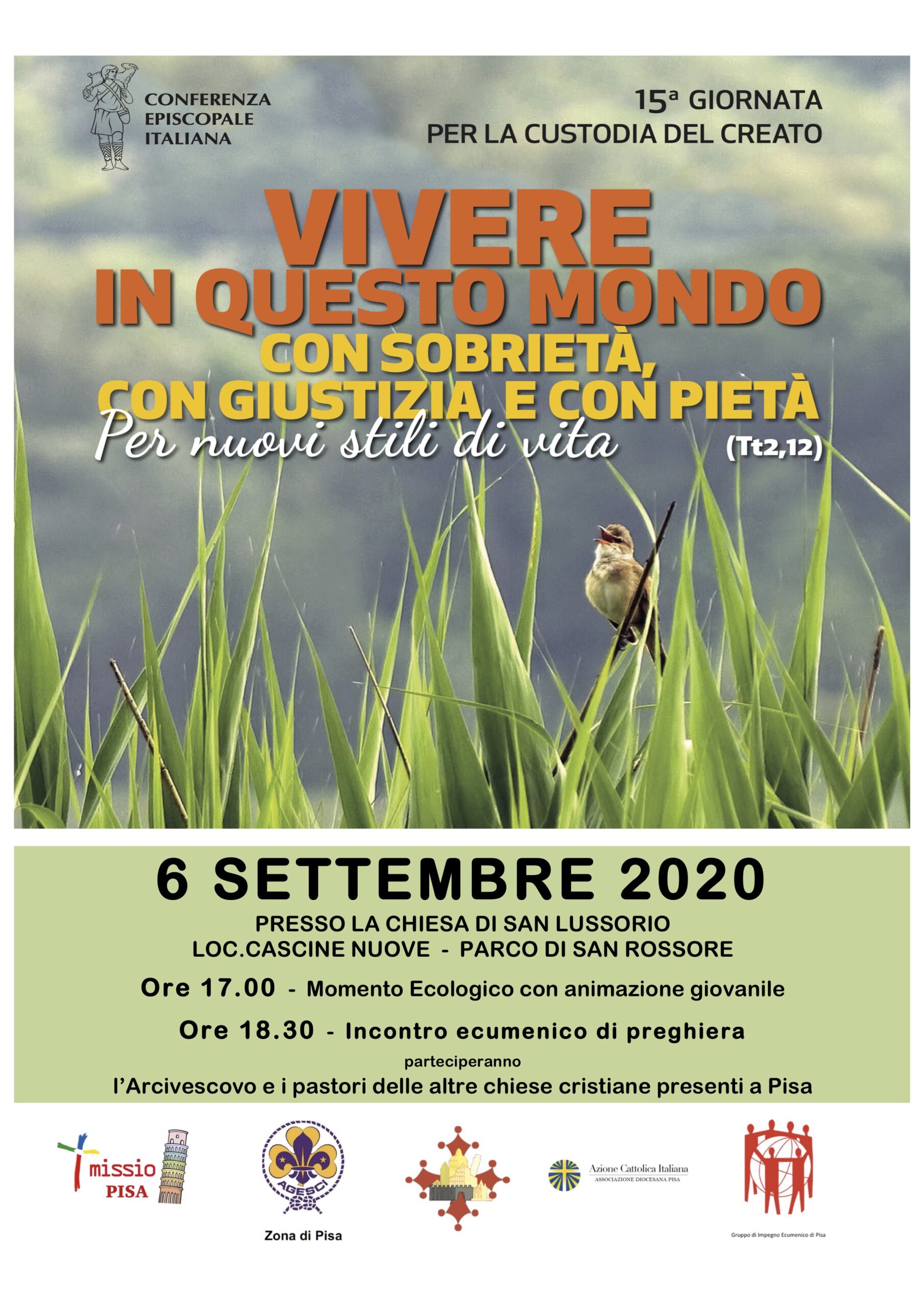 L’Ufficio Missionario diocesano in collaborazione con il Gruppo di impegno Ecumenico di Pisa, l’Azione Cattolica diocesana, le Aggregazioni Laicali e gli Scout ha promosso anche a Pisa un’occasione di incontro e di preghiera che non poteva aver cornice migliore della tenuta di San Rossore, dove vivremo un momento di servizio ecologico con i giovani presenti e un momento di preghiera per il Creato. La consapevolezza di essere creature dentro un pianeta bellissimo ma fragilissimo ci farà alzare la voce al Dio Creatore e Signore, perché possa aiutarci a diventare sempre di più e meglio custodi dei beni della creazione per vivere – come dice lo slogan della giornata – con sobrietà, con giustizia e con pietà. Riportiamo qui sotto il Volantino/Locandina che contiene il programma del pomeriggio insieme, proposto per la Domenica 6 settembre 2020, nel rispetto del distanziamento sociale e delle norme di sicurezza anti-Covid19.