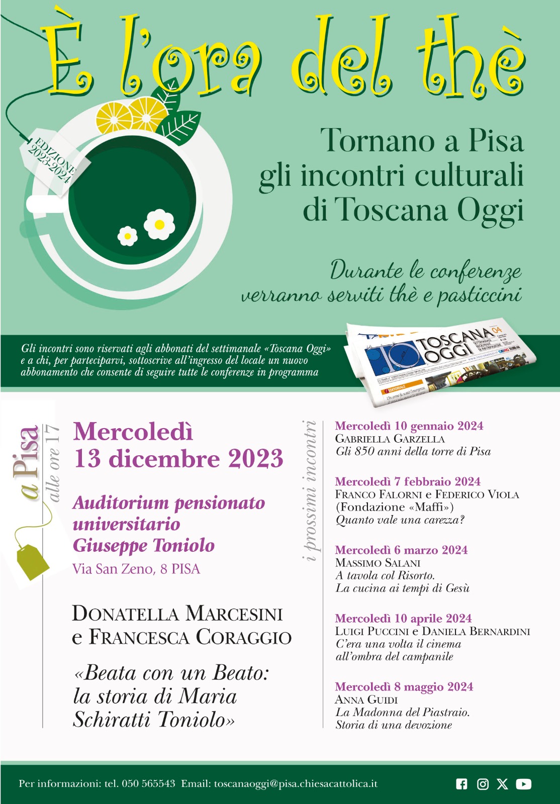 «Beata con un Beato». Sarà dedicato alla figura di Maria Schiratti il «thè di Toscana Oggi» in programma il prossimo mercoledì 13 dicembre alle ore 17 all’auditorium del pensionato Toniolo, a Pisa in via San Zeno 8.