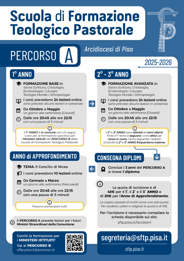 La Scuola di Formazione Teologico Pastorale (SFTP), articolata nelle quattro sedi diocesane (Barga, Pietrasanta, Pisa e Pontedera, propone anche quest’anno un percorso comune articolato in un primo anno di base dove saranno offerte lezioni online sulla Sacra Scrittura, Cristologia, Ecclesiologia / Liturgia e Teologia Morale / Antropologia.