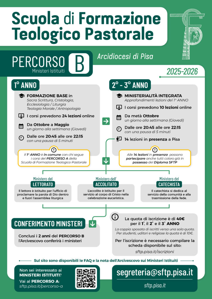 Percorso B sono due anni di formazione rivolti ai candidati ai Ministeri Istituiti (Lettore, Accolito, Catechista). Le lezioni sono articolate in più moduli. Il primo di questi propone lezioni sulla Parola in comunione con gli anni II e III del Percorso A. Segue un modulo di Ministerialità Integrata (lezioni online) e termina con il modulo finale, in presenza, che si articola in lezioni comuni tra Lettorato e Accolitato per poi offrire lezioni specifiche per ogni Ministero Istituito. Conclusi i due anni l’Arcivescovo conferirà i Ministeri ai candidati pronti per questo importante servizio alla Chiesa locale.
