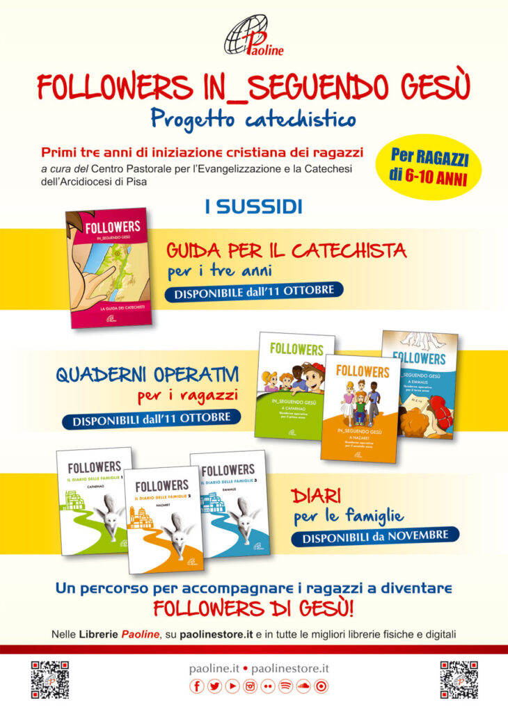 Da LUNEDÌ 11 OTTOBRE saranno disponibili in libreria i sussidi del Progetto Catechistico «Followers. In_Seguendo Gesù»: intanto abbiamo la «Guida per il Catechista», unica per i tre anni (costo: 12 Euro), e i Quaderni Operativi per i bambini dei gruppi…