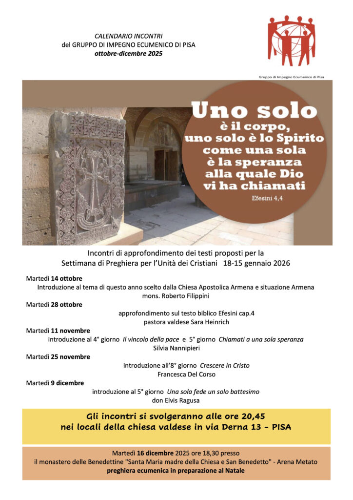 Martedì 14 ottobreIntroduzione al tema di questo anno scelto dalla Chiesa Apostolica Armena e situazione Armenamons. Roberto Filippini Martedì 28 ottobreApprofondimento sul testo biblico Efesini cap.4 pastora valdese Sara Heinrichpastora valdese Sara Heinrich Martedì 11 novembreIntroduzione al 4° giorno Il…